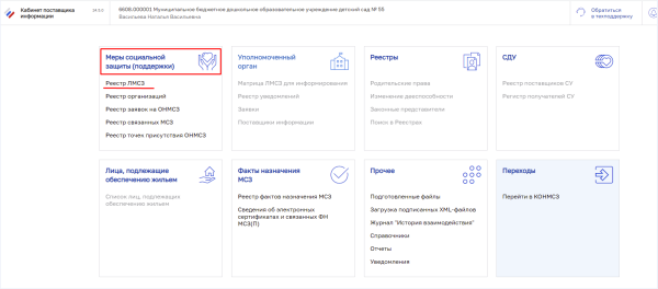 - Переходим в пункт «Реестр ЛМСЗ» раздела «Меры социальной защиты (поддержки)».